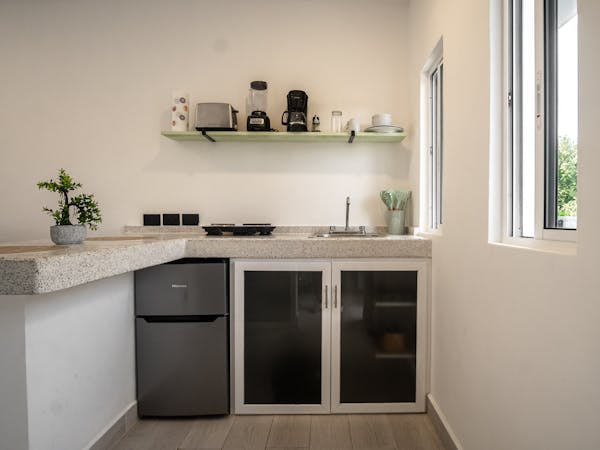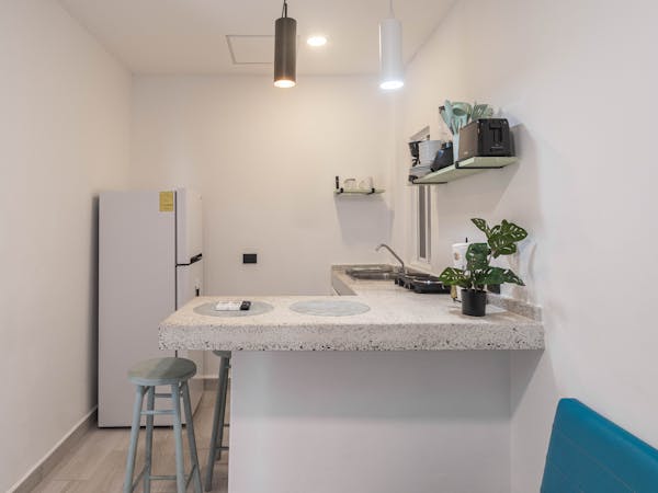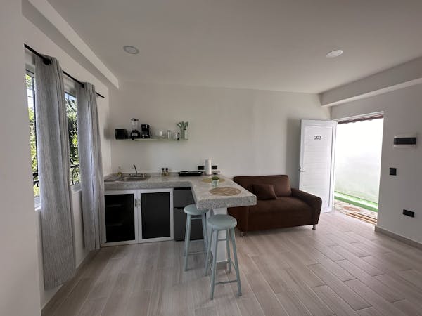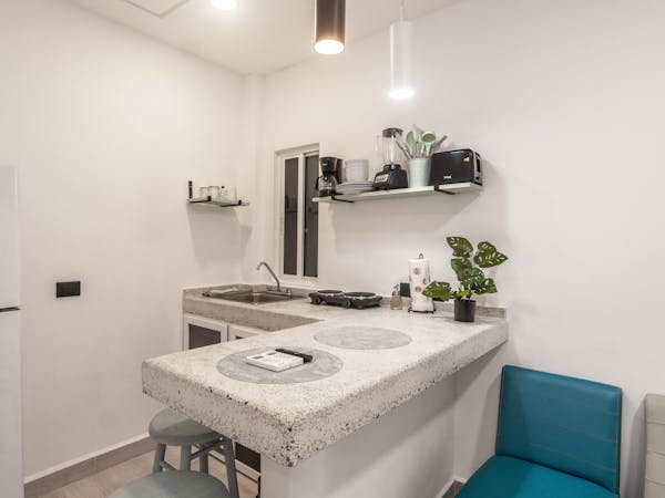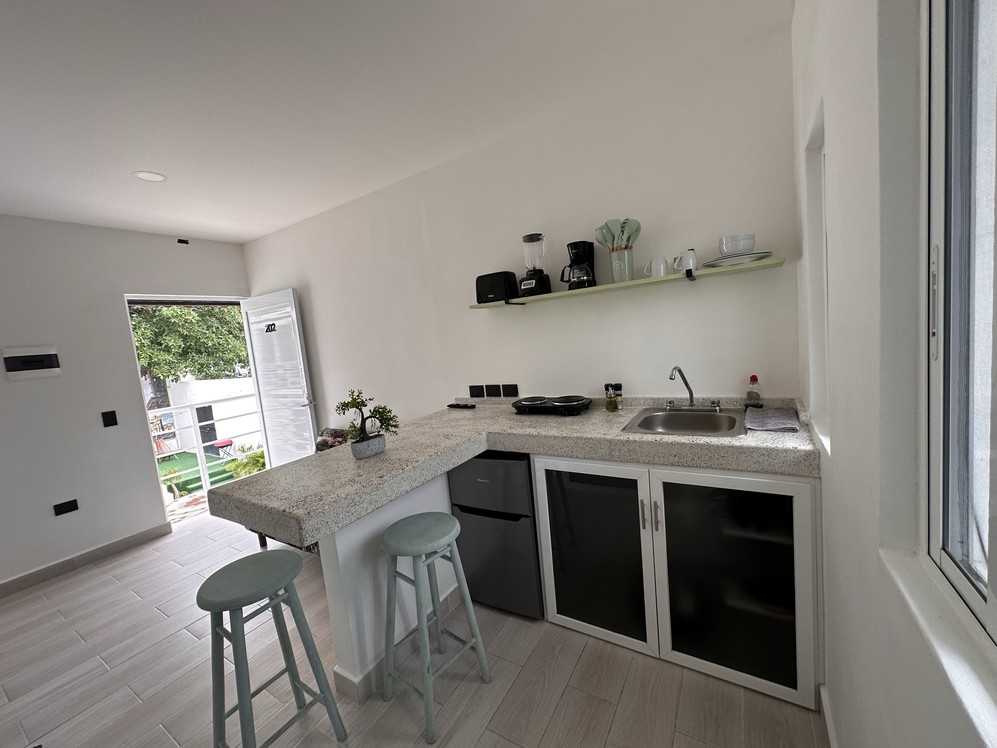 "Enjoy the paradisiacal essence of Playa del Carmen in this charming apartment. Steps away from stunning beaches, soft sand and crystal clear waters await you. Relax in the spring water pool and admire Fifth Avenue from the balcony. Fully equipped kitchen, comfortable queen bed and TV for your favorite shows. Luxury, comfort and natural beauty in a peaceful place."